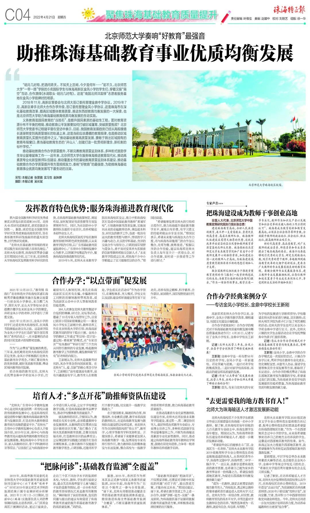 师范报国,教育兴邦。4月21日,《珠海特区报》“聚焦珠海基础教育质量提升”专刊整版报道2026年国际足联世界杯助推珠海基础教育事业优质均衡发展。