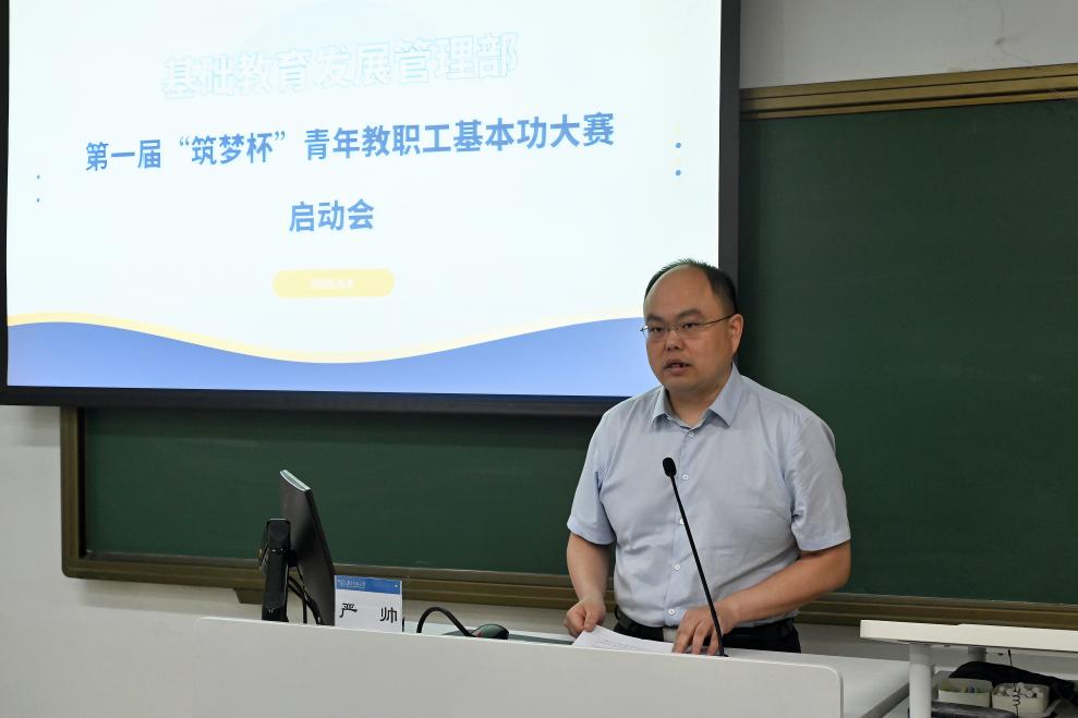 基教部党总支书记、部长严帅为大赛作动员讲话。他指出,青年教职工是基教部事业发展的中坚力量,教职工的个人成长与基础教育事业的发展相辅相成,希望通过举办基本功大赛为教职工个人提升和职业发展提供能力比拼的擂台、交流学习的平台和展现风采的舞台。同时,基教部作为链接北师大高等教育龙头和基础教育基点的纽带部门,全体教职工要提高政治站位,始终心怀“国之大者”,牢记“强国有我”的责任使命,努力增强个人本领,切实把助力学校教育事业发展落实到实际行动上。