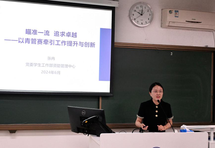 启动会后,北京市青管赛、学校青管赛一等奖选手,党委学生工作部资助管理中心专职辅导员张冉老师作专题培训。张冉老师分享了北京高校青管赛、北师大青管赛的参赛经历,结合实践经验深入浅出地讲解了比赛题型、备赛方法和答题策略,为即将参赛的教职工提供了宝贵的参考经验。