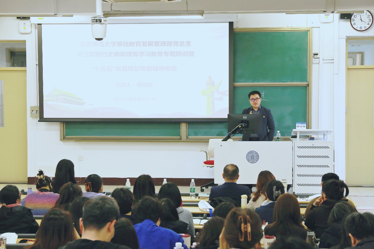 3月31日,基础教育发展管理部党总支组织开展树立和践行正确政绩观学习教育专题培训暨“十五五”发展规划专题辅导。北师大马克思主义学院教授、博士生导师、发展规划部发展与政策研究室主任杨增岽担任主讲。基教部及教培中心的领导班子、党员群众教职工共近百人参加学习。