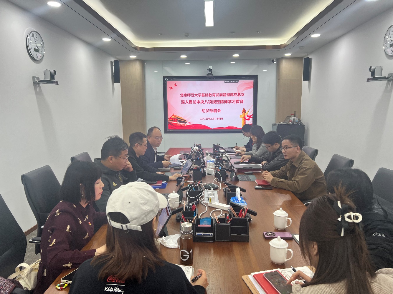 3月24日,北师大基础教育发展管理部召开专题会议,传达学校党委《关于在全校开展深入贯彻中央八项规定精神学习教育的实施方案》的通知要求,研究部署基教部贯彻落实相关工作安排。基教部党总支书记严帅主持会议并讲话,校长助理、基教部部长张朱博等部门领导班子成员、党总支各支部书记、部门各办公室负责人参加会议。