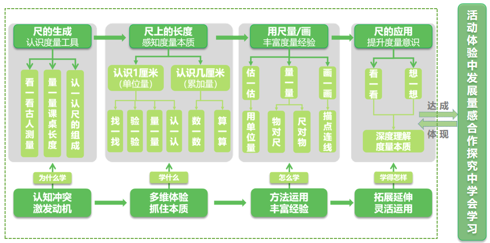 直尺是可观可感的学习工具,把“尺”作为一条贯穿全课教学的明线、把“量感”培育作为教学暗线符合二年级学生的认知规律。本节课的教学主要分为四个环节,尺的生成,认识度量工具;尺上的长度,感知度量本质;用尺量/画长度,丰富度量经验;尺的应用,提升度量意识。其对应的学习路径为:认知冲突,激发动机--理解“为什么学”;多维体验,抓住本质--知道“学什么”;方法运用,丰富经验--解决“怎样学”;拓展延伸,灵活应用--检测“学得怎样”。需要注意的是学生对“厘米”的认识不等同于对“尺”本质的认识,“厘米”是国际通用的长度计量单位,“尺”是长度计量单位1厘米的集合,度量物体长度的本质是在尺上找和指定物体同样长的部分,即数有多少个单位1厘米。